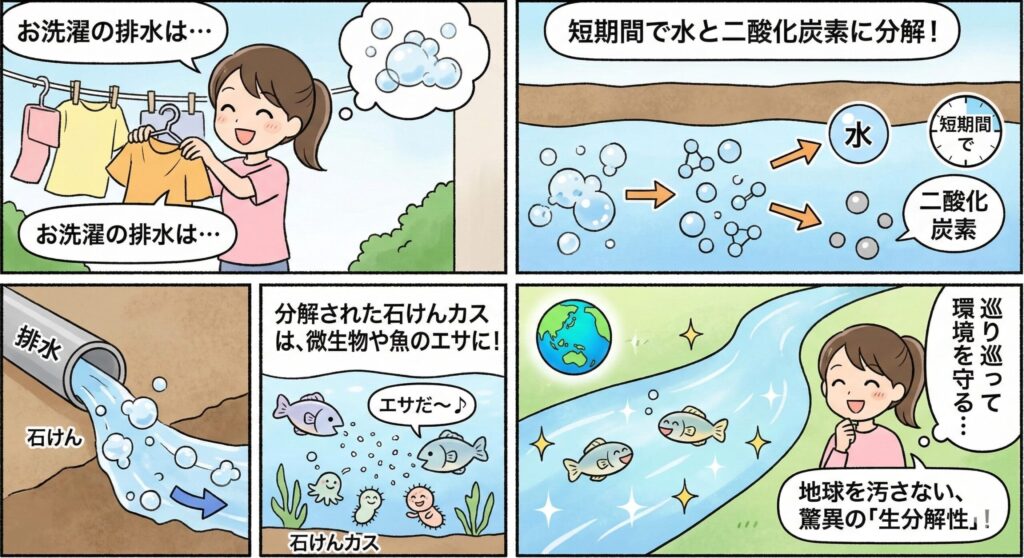 石けんの排水は、短期間で水と二酸化炭素に分解されます。それどころか、分解された石けんカスは、川や海の微生物や魚のエサにさえなるんです。お洗濯をすることが、巡り巡って環境を守ることにつながる……なんだか素敵なことだと思いませんか?