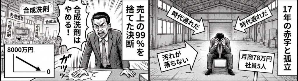 売上の99%を占めていた合成洗剤を廃止した結果、月商8000万円あった売上は、たったの78万円にまで激減しました。