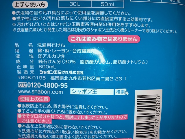 公式:液体石けんの使用量の目安(シャボン玉石けん)