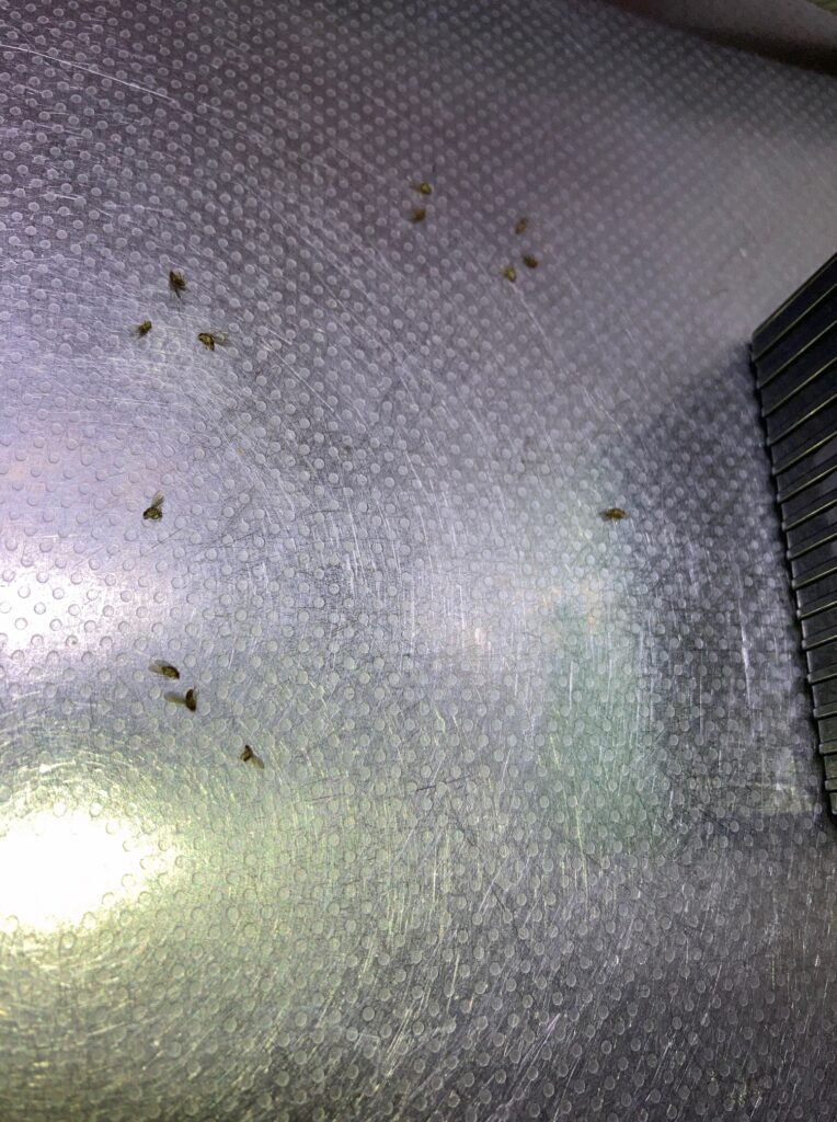 特筆すべきは、コバエたちが「容器の中」で死んでいるだけではなかったことです。驚いたことに、キューブの周囲、キッチンの天板の上にも、数えきれないほどのコバエが力尽きて散乱していました。