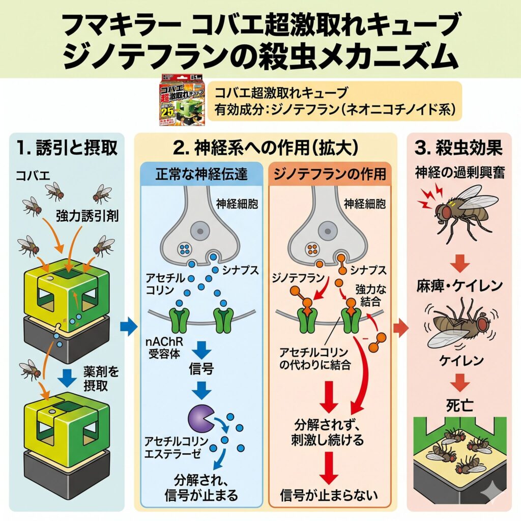 図解にもある通り、ジノテフランはコバエの神経を過剰に刺激し続けます。薬が効き始めると、コバエは自分の意志通りに動けなくなり、ケイレンを起こしたり、パニックになったように周辺を狂ったように飛び回ったりします。そして、最終的に神経が完全に麻痺して力尽き、罠のすぐ近くにポトッと落ちて死に至ります。